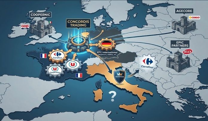 Cosa cambia nello scacchiere delle supercentrali europee degli acquisti con l'avvio operativo di Concordis Trading che unisce Carrefour, Coopérative U e Rtg International e quale ruolo gioca la gdo italiana